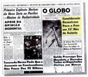Circula na internet uma primeira página do Globo de 1964, pré-golpe, em que o décimo-primeiro salário criado por Jango Goulart era tratado como “desastroso”.